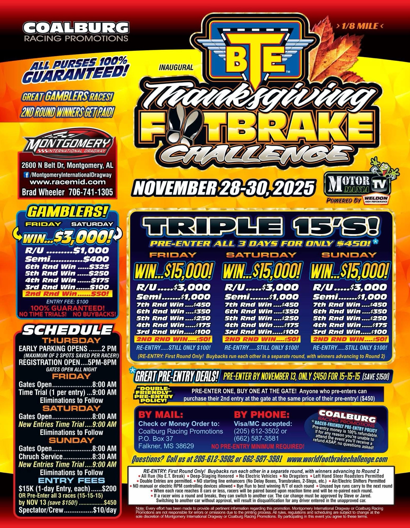 Share Facebook Twitter Reddit Telegram Pinterest Email 2025 BTE Thanksgiving Footbrake Challenge location change. Montgomery International Dragway is the new home for this event. We hope to see you there Footbrakers!